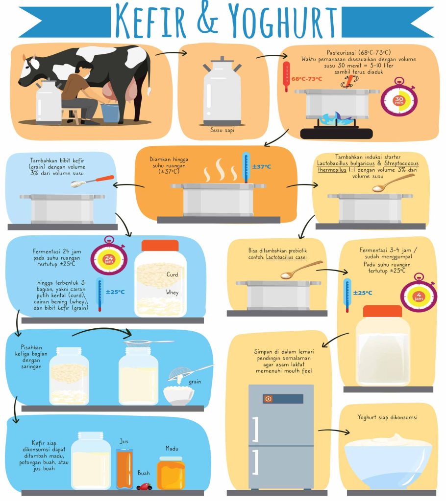 Kabar baiknya pembuatan kefir dan yoghurt dapat dilakukan di rumah. Lazimnya produksi yoghurt melibatkan dua bakteri gram positif yakni Lactobacillus bulgaricus dan Streptococcus thermophilus. “Kedua mikrob itu bekerja sama. Bakteri satu menghasilkan metabolit yang dikonsumsi bakteri lain,” kata magister ilmu peternakan alumnus Institut Pertanian Bogor itu.