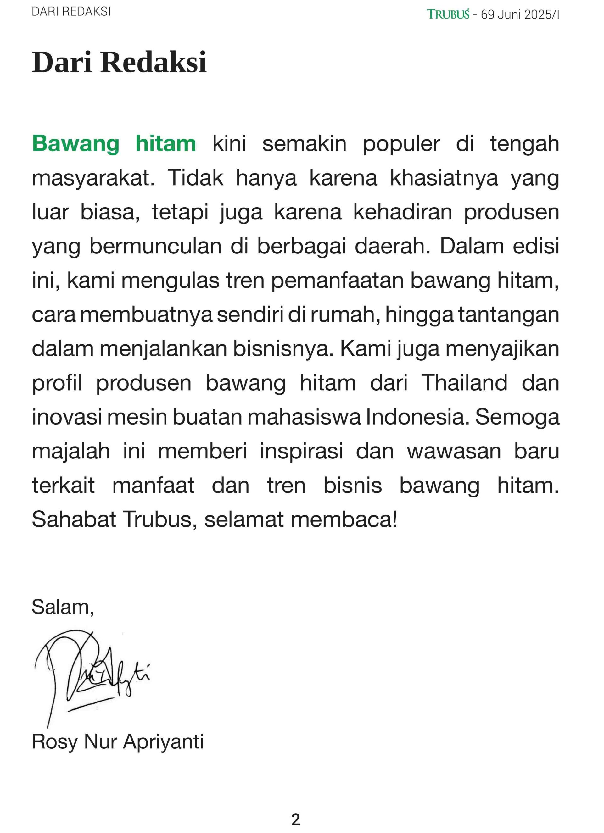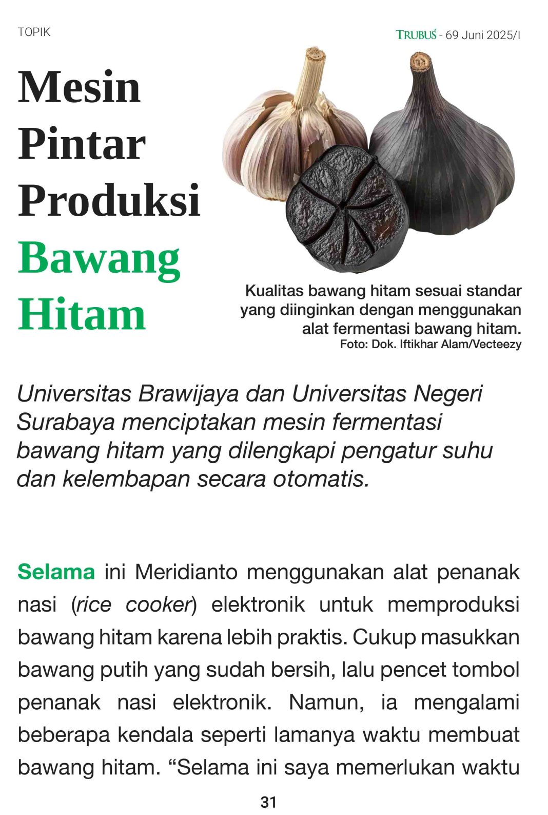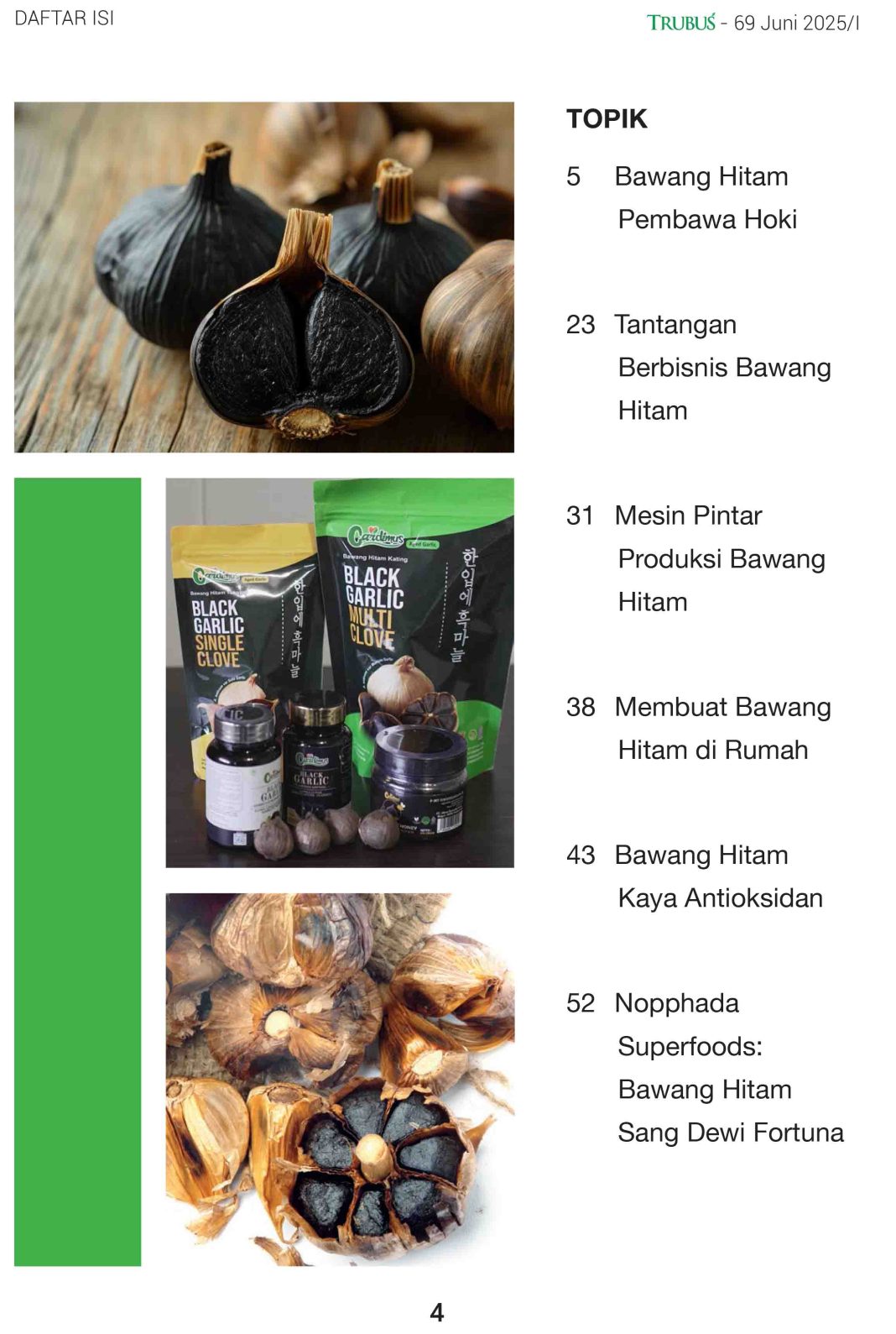Bawang hitam kini semakin populer di tengah masyarakat. Tidak hanya karena khasiatnya yang luar biasa, tetapi juga karena kehadiran produsen yang bermunculan di berbagai daerah. Dalam edisi ini, kami mengulas tren pemanfaatan bawang hitam, cara membuatnya sendiri di rumah, hingga tantangan dalam menjalankan bisnisnya. Kami juga menyajikan profil produsen bawang hitam dari Thailand dan inovasi mesin buatan mahasiswa Indonesia. Semoga majalah ini memberi inspirasi dan wawasan baru terkait manfaat dan tren bisnis bawang hitam.