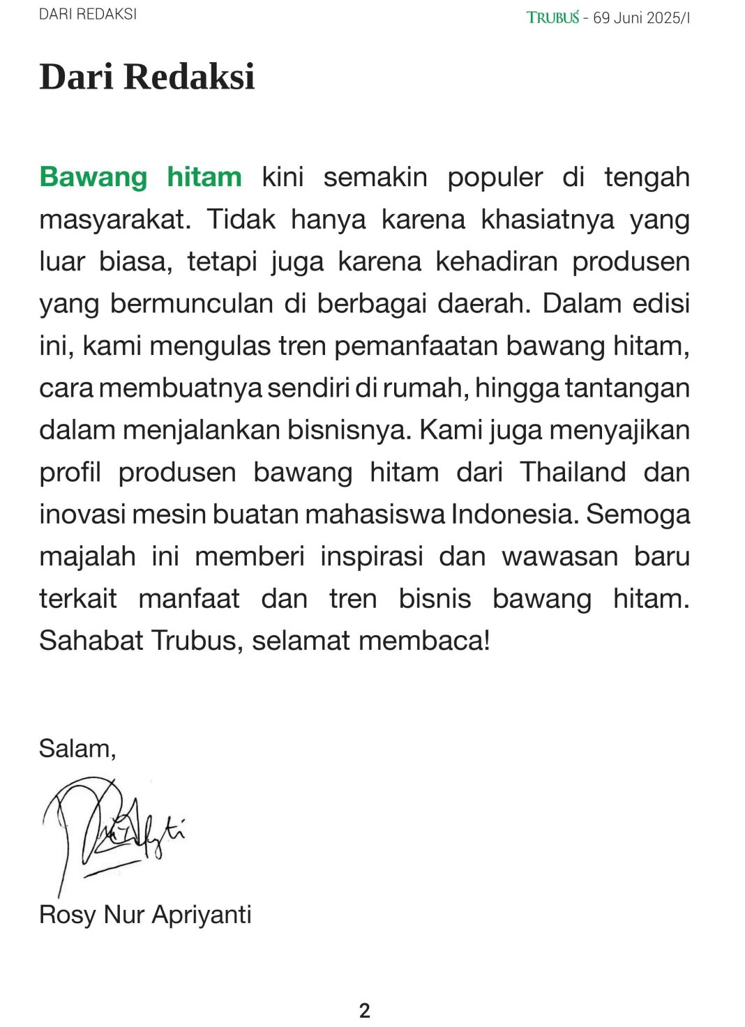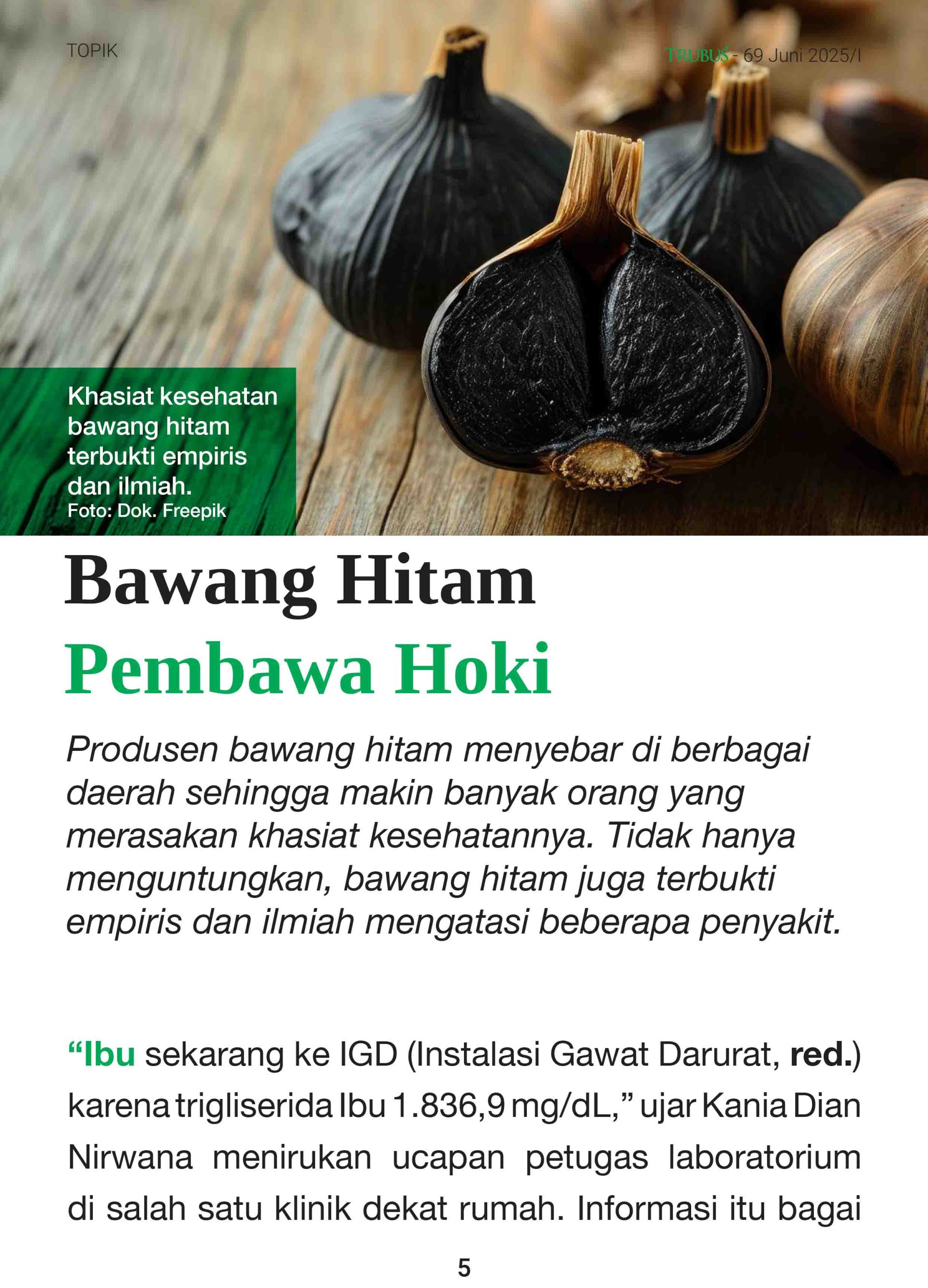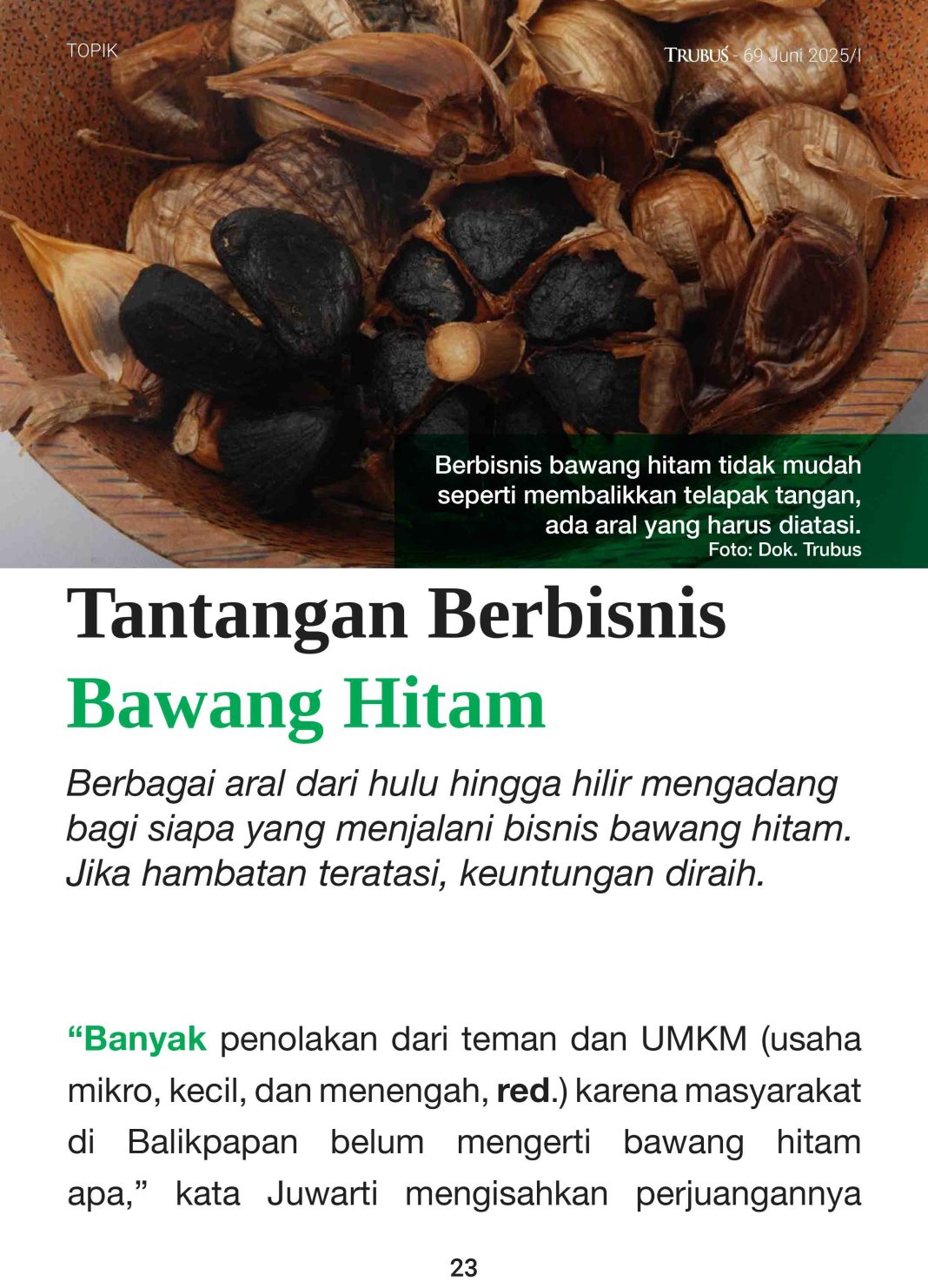 Bawang hitam kini semakin populer di tengah masyarakat. Tidak hanya karena khasiatnya yang luar biasa, tetapi juga karena kehadiran produsen yang bermunculan di berbagai daerah. Dalam edisi ini, kami mengulas tren pemanfaatan bawang hitam, cara membuatnya sendiri di rumah, hingga tantangan dalam menjalankan bisnisnya. Kami juga menyajikan profil produsen bawang hitam dari Thailand dan inovasi mesin buatan mahasiswa Indonesia. Semoga majalah ini memberi inspirasi dan wawasan baru terkait manfaat dan tren bisnis bawang hitam.