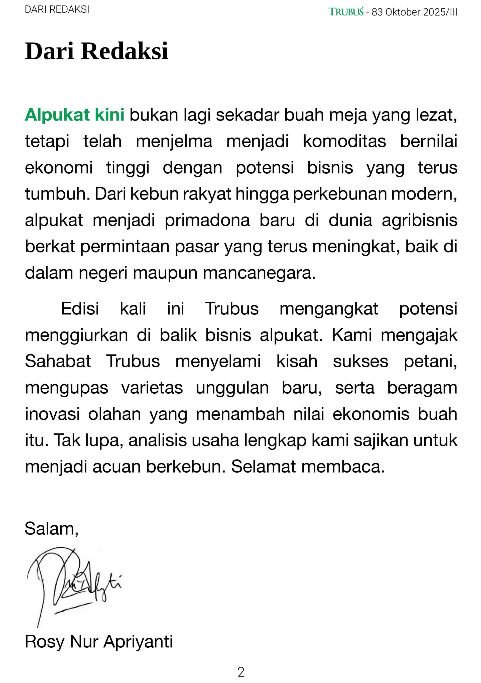 Edisi kali ini Trubus mengangkat potensi menggiurkan di balik bisnis alpukat. Kami mengajak Sahabat Trubus menyelami kisah sukses petani, mengupas varietas unggulan baru, serta beragam inovasi olahan yang menambah nilai ekonomis buah itu. Tak lupa, analisis usaha lengkap kami sajikan untuk menjadi acuan berkebun.