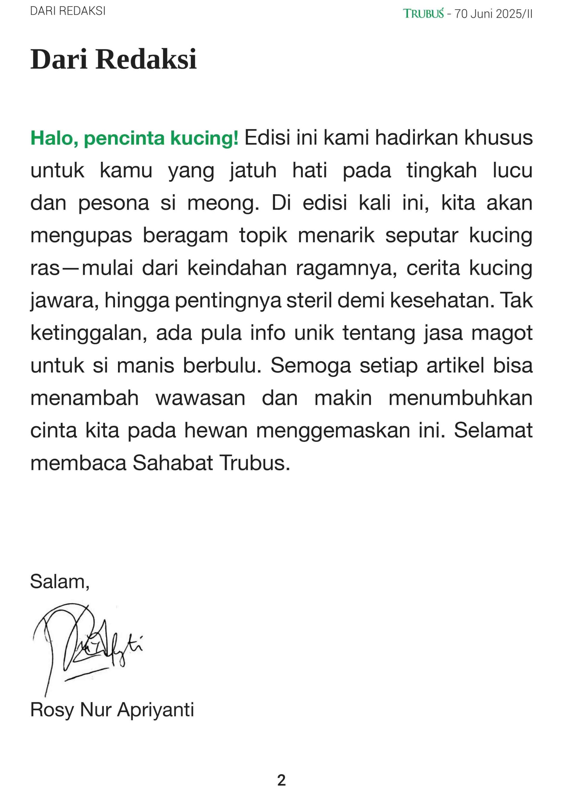Halo, pencinta kucing! Edisi ini kami hadirkan khusus untuk kamu yang jatuh hati pada tingkah lucu dan pesona si meong. Di edisi kali ini, kita akan mengupas beragam topik menarik seputar kucing ras—mulai dari keindahan ragamnya, cerita kucing jawara, hingga pentingnya steril demi kesehatan. Tak ketinggalan, ada pula info unik tentang jasa magot untuk si manis berbulu. Semoga setiap artikel bisa menambah wawasan dan makin menumbuhkan cinta kita pada hewan menggemaskan ini.