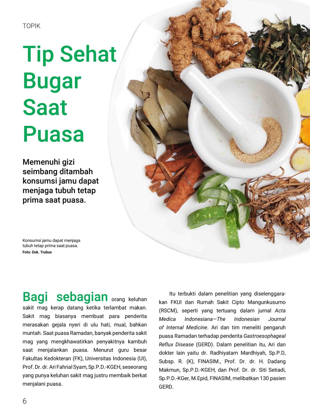 Riset terbaru dari para ahli di FKUI-RSCM menunjukkan bahwa penderita GERD atau mag justru bisa merasakan perbaikan kondisi kesehatan saat berpuasa. Kuncinya bukan pada berhenti makan, melainkan pada pengaturan pola makan yang lebih disiplin dan asupan gizi yang seimbang. Selain pola makan, menjaga kebugaran juga bisa diupayakan melalui kekayaan alam kita.