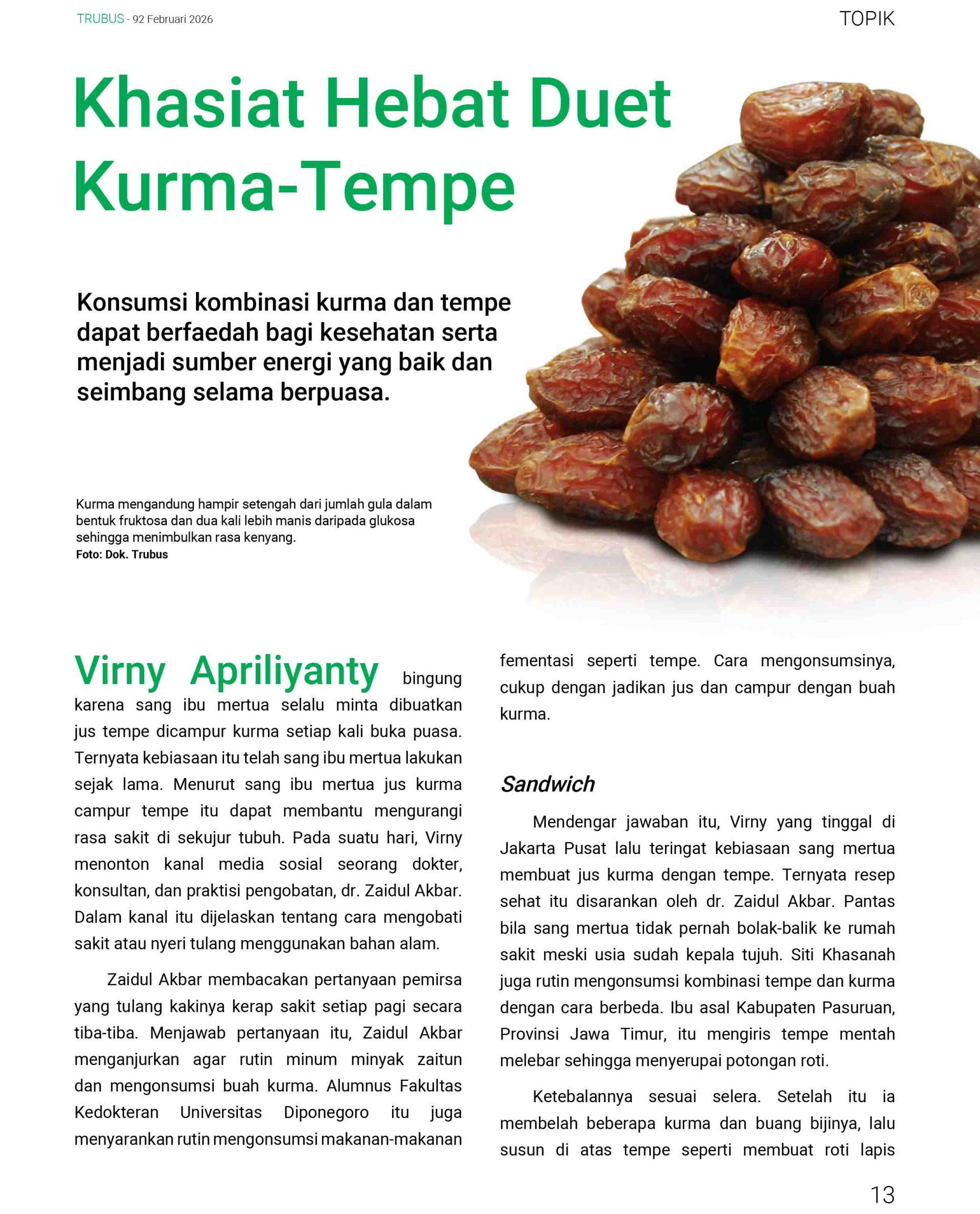 Majalah Trubus mengulas berbagai cara agar tetap sehat dan bugar saat puasa dalam rubrik Topik. Salah satu artikelnya adalah aneka buah yang bisa dikonsumsi dan menyehatkan saat puasa selain kurma. Bagi pekebun durian ada artikel tentang budi daya si raja buah secara organik. Untuk obat tradisional ada riset terbaru yang menunjukkan lalapan daun pohpohan berkhasiat antidiabetes. Yang tak kalah menarik cerita pengalamanMuhammad Nasrul Fatah mengembangkan ekspor daun torbangun dan aneka rempah.